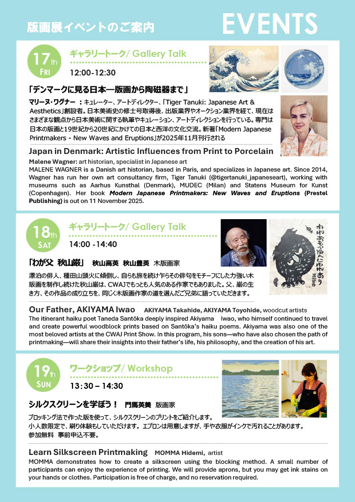 During the exhibition period, we are holding a gallery talk by Malene Wagner, who will discuss the influence of Japonisme in Denmark, an artist talk by the sons of Akiyama Iwao, who will speak about their father’s works, and a silkscreen workshop led by Momma Hidemi.